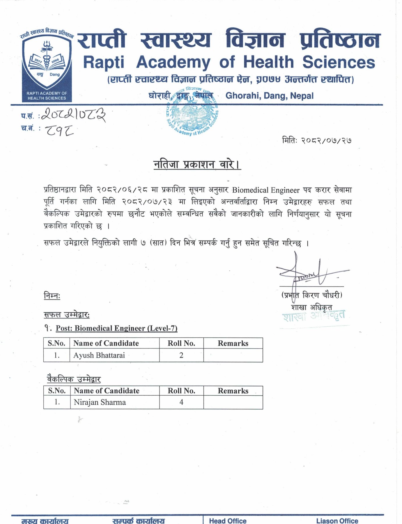 Biomedical Engineer पदको नतिजा प्रकाशन सम्बन्धी सूचना।
