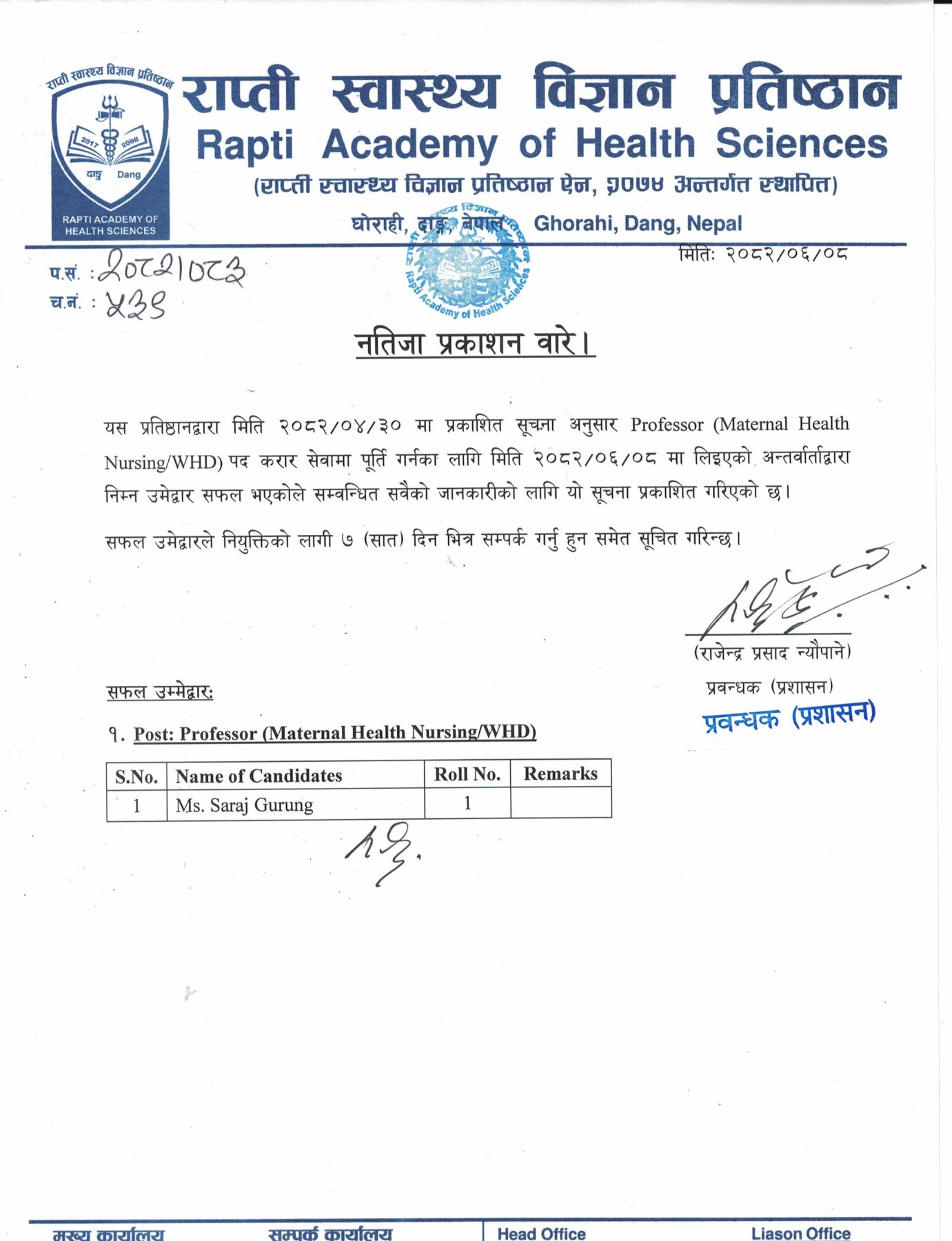 नतिजा प्रकाशन सम्बन्धी सूचना।